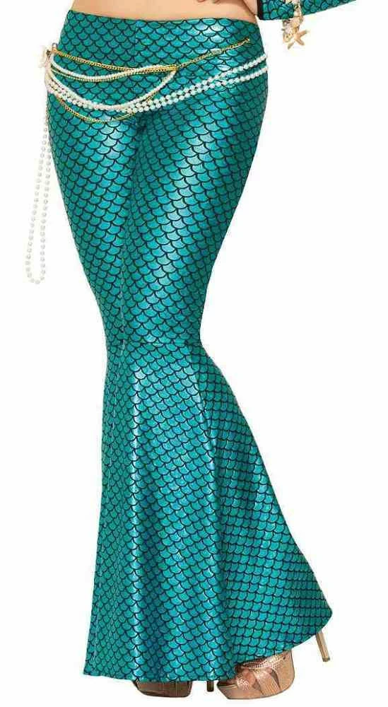 Our Mermaid Flared, leggings are turquoise with a mermaid scale print, with an attached pearl and chain belt with starfish design.