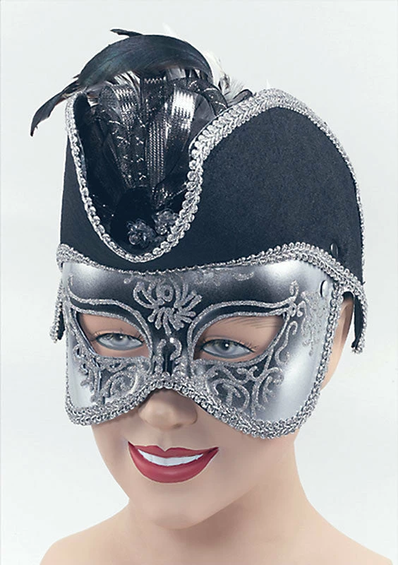 Black/Silver pirate style mask with ribbon, sequins and feathers.