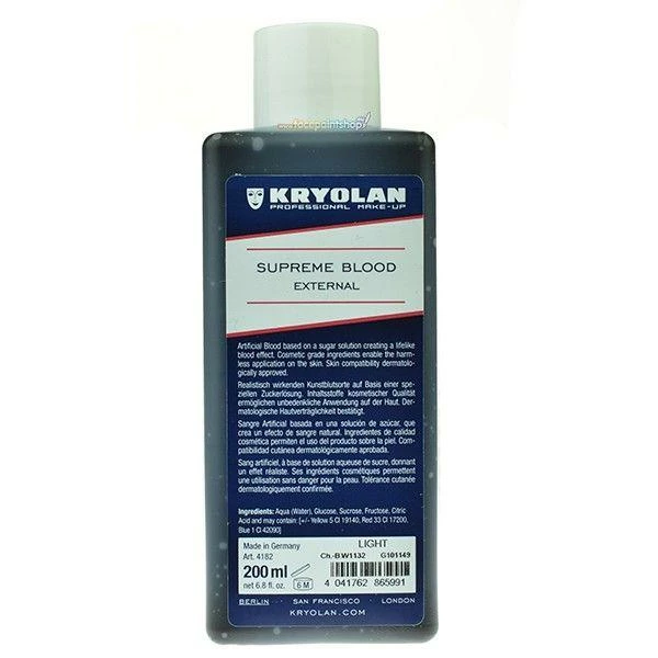 Our Kryolan, Supreme Blood, External Light is a sugar-based artificial blood formulated for creating realistic-looking special effects.