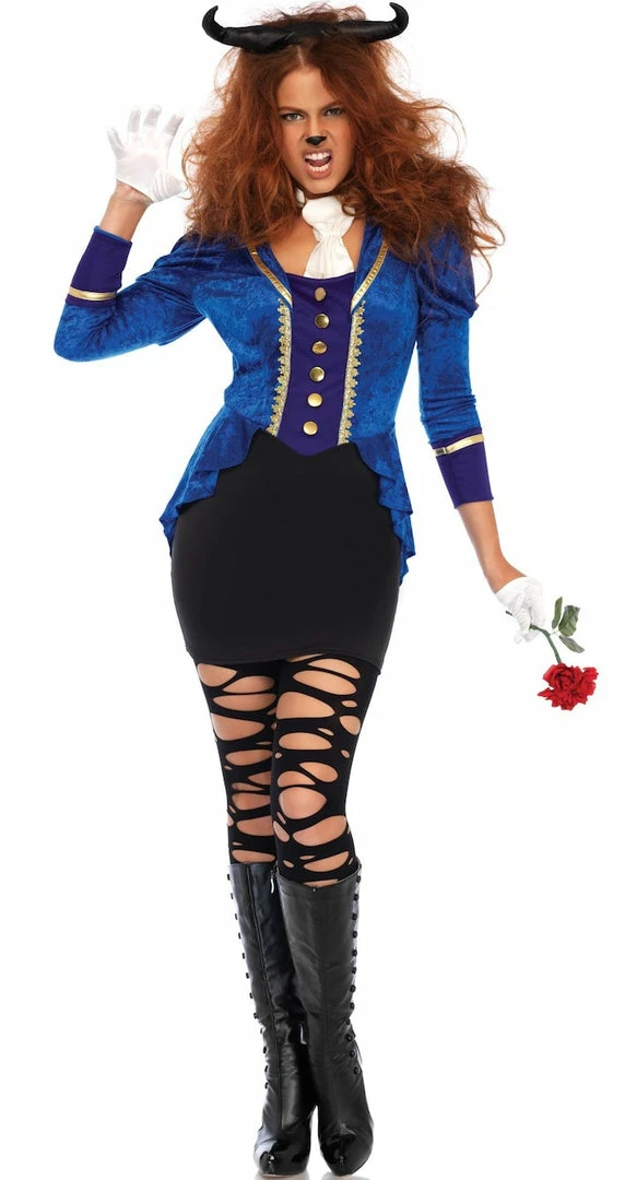 Our Leg Avenue 3pc. Beastly Beauty costume, includes a blue velvet tuxedo dress in combination with stretch fabric and golden trims and buttons, jabot neck piece and horn headband.