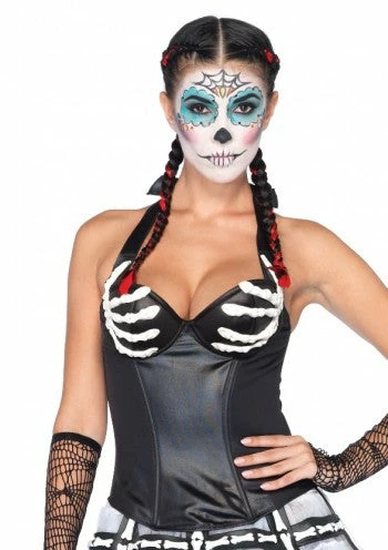 Our Leg Avenue Bony Hands Wet Look Underwire Halter Corset is a twist sexy on a Halloween Costume.