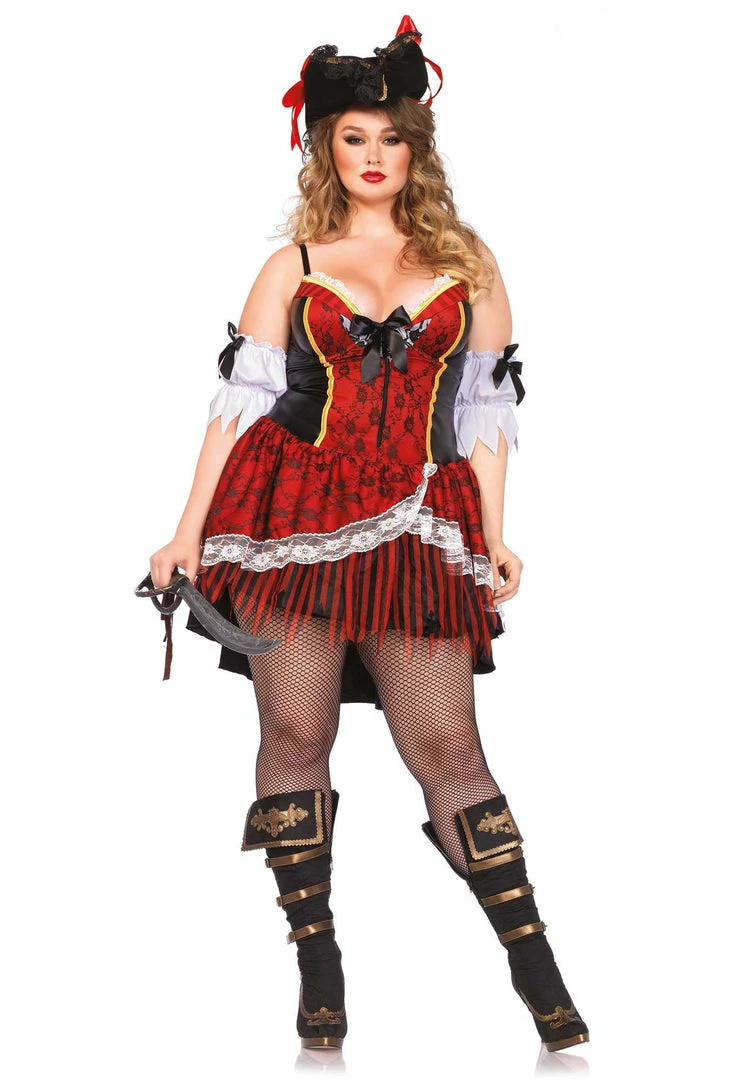 Our Leg Avenue 2PC pirate costume is a shaping dress with moulded underwire cups, lace details and matching arm puffs.
