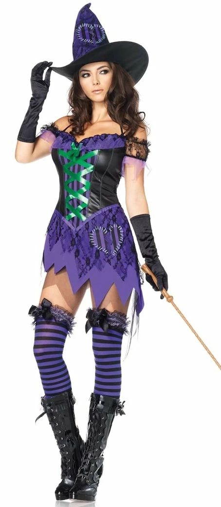 Our Leg Avenue Crafty Cutie Witch Costume includes a Purple and Black Halter Lace Trimmed Dress with layered Zig Zag Hem.