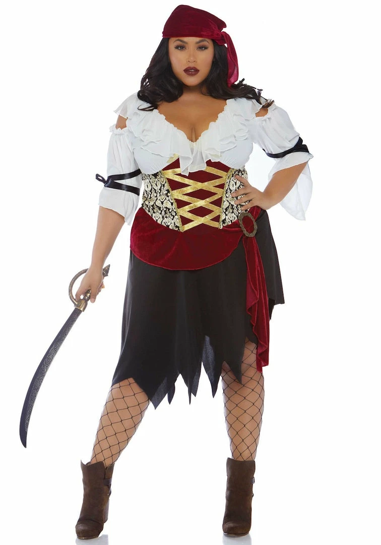 Our Leg Avenue 2pc. High Seas Wench includes, peasant dress with attached velvet sash with ornate buckle and head scarf