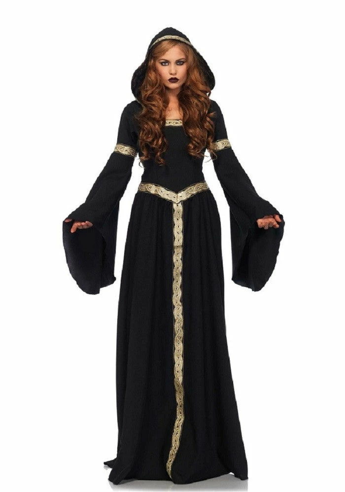 Our Leg Avenue, Pagan Witch costume includes a long hooded cloak with an embroidered celtic braid trim and corset with a lace up back.