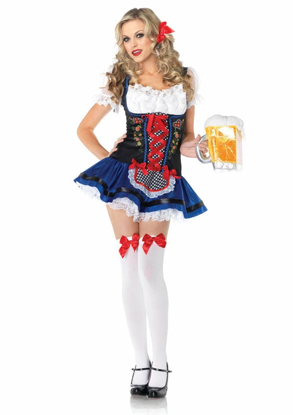 Our Leg Avenue Flirty Frauline fancy dress costume features a ribbon trimmed apron dress with lace ruffle bodice.