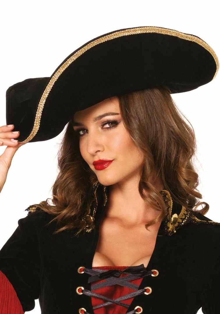 Our Leg Avenue, Gold Trim Pirate Hat is the perfetc acessory to complete any female pirate costume.