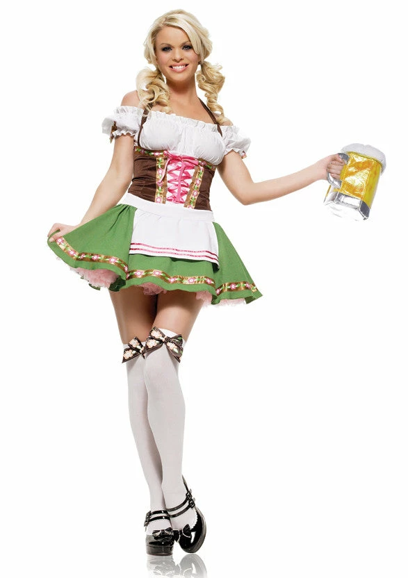 Our Leg Avenue, Gretchen, 2 piece fancy dress costume features a peasant top dress with a satin ribbon trim and stockings with matching bows.