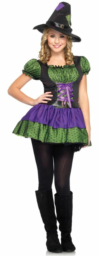 Our Leg Avenue, Junior 2Pc. Hocus Pocus Costume includes a peasant dress and matching witch hat.