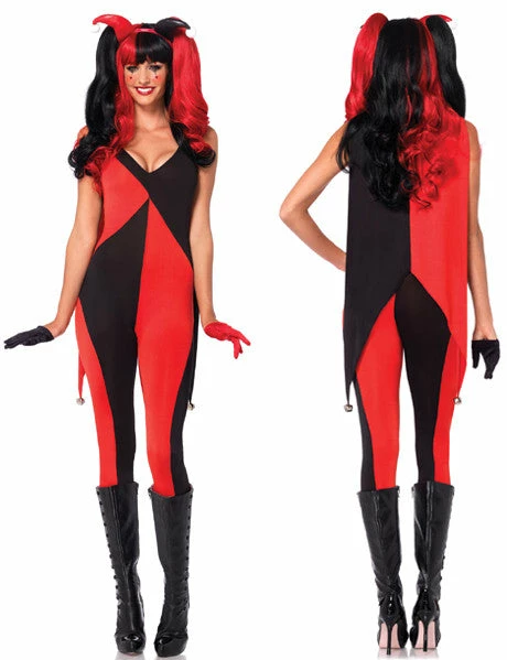 Our Leg Avenue, Harely Quinn 2Pc. Jingle Jester includes a spandex catsuit with bell draped shoulders and matching horn headband.