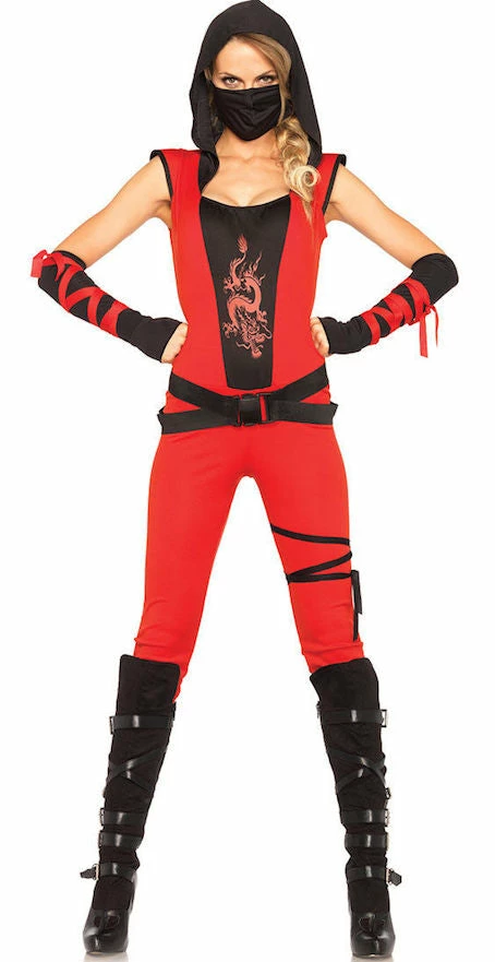 Our Leg Avenue 4PC. Ninja Assassin, includes hooded catsuit with leg wrap, duel strap belt, wrap arm warmers and face mask.