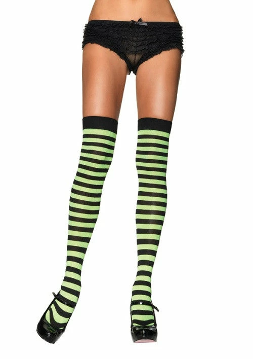 Our Leg Avenue, Black and Kelly Green Nylon Thigh Highs are great to add a touch of glamour to your costume. One size.