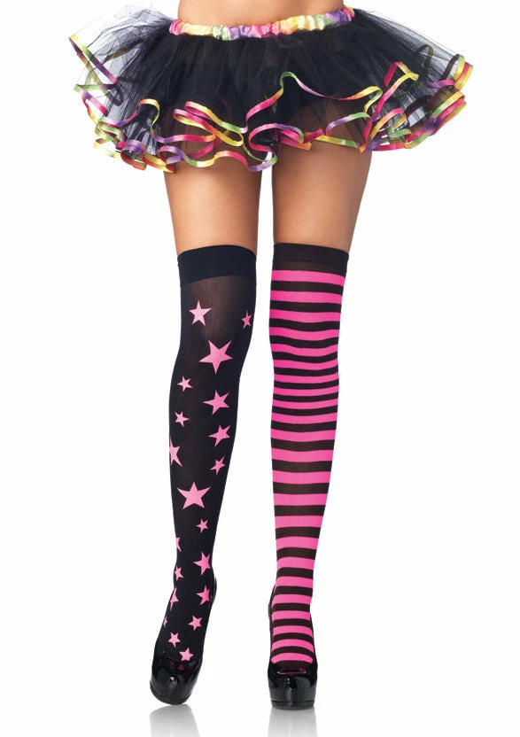 Nylon Thigh Highs, Pink and Black Stars and Stripes