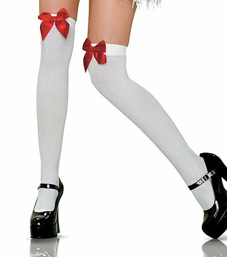 Our Leg Avenue, White with Red Bows Nylon Thigh Highs are great to add a touch of glamour to your costume. One size.