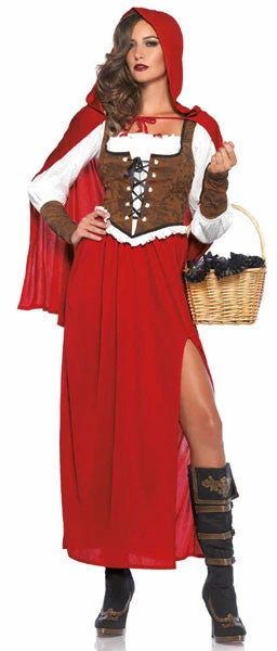 Our Leg Avenue, 3pc. Woodland Red Riding Hood, includes long high slit dress with faux leather lace up bodice, matching wrist cuffs, and hooded cape.