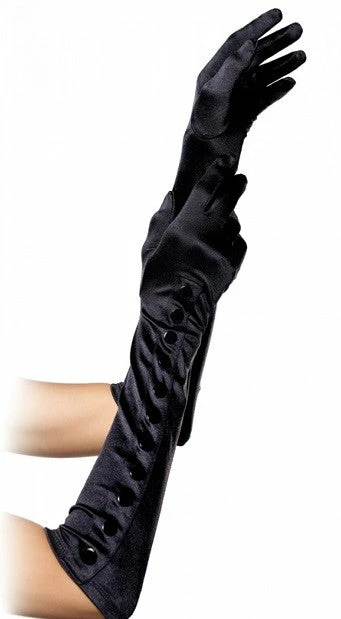 Our leg avenue long, black satin gloves have a black button detail and are the perfect addition to a glamorous costume.