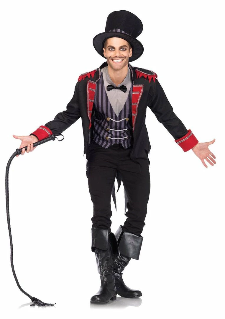 Our Leg Avenue 3PC Sinister Ring Master Costume Set includes jacket with tattered tails, shirt and vest combo with bow tie accent and matching top hat.