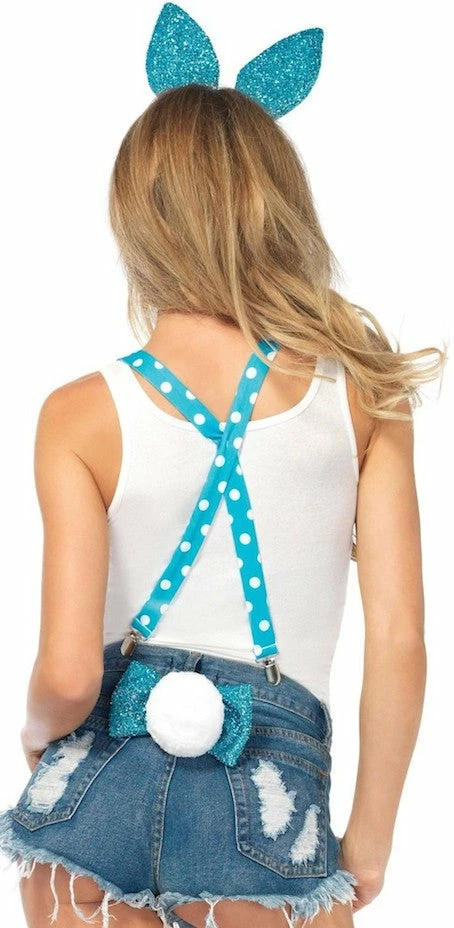 Our Leg Avenue, Sparkle Bunny Kit, Blue comes complete with clip on suspenders, glitter bow tie tail and sequin ear headband.