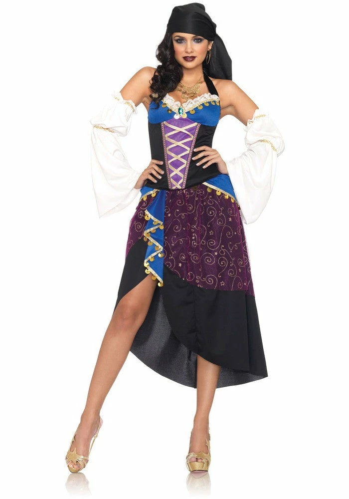 Our Leg Avenue, Tarot Card Gypsy costume will have you reading family and friends palms within minutes, the costume consists of a coin trimmed bone effect bodice top and side runched skirt, the matching head scarf and flared sleeves.