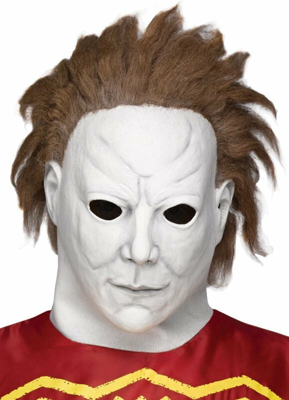 Our Michael Myers, The Beginning mask is a full overhead latex mask with expressionless face and short brown hair attached.