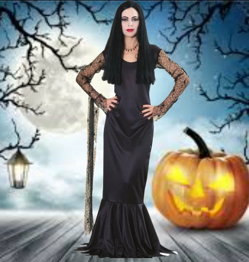 This licensed Addams Family includes a full length dress in satin with mermaid skirt and jagged hemline, with full length lace sleeves with satin cap at top and spiderweb look to lace