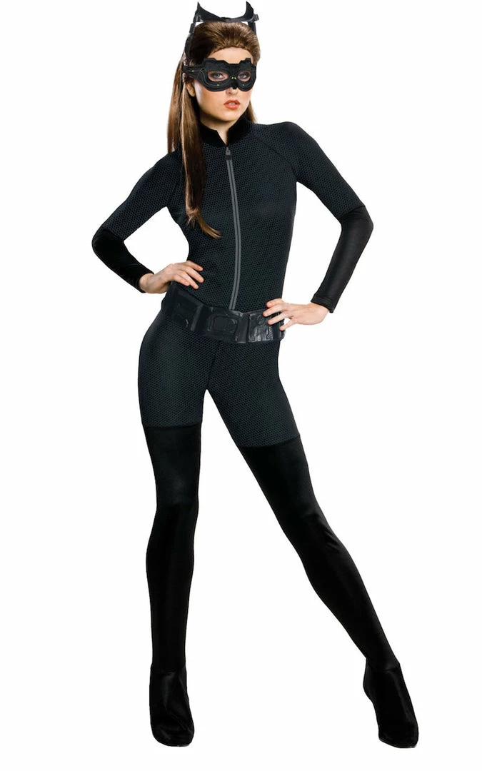 This officially licensed The Dark Knight Rises Catwoman Costume includes a black jumpsuit with attached boot covers, black eyemask and a belt.