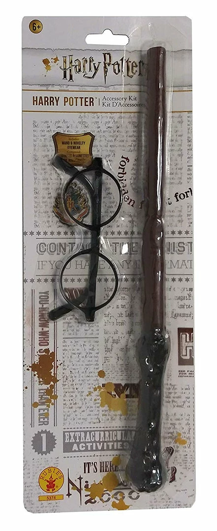 This kit includes a wooden effect looking wand and circular schoolboy glasses.Â