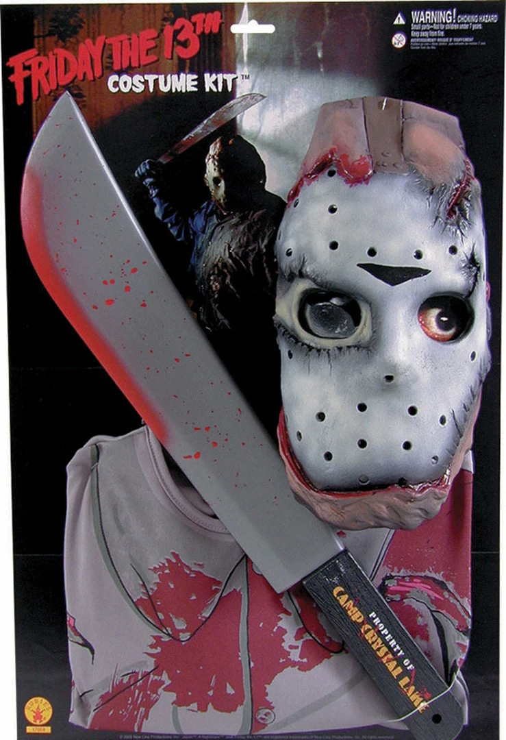 Our Licensed Friday the 13th costume kit, includes latex face mask, PVC blade with property of Camp Crystal Lake on the handle and blood stained tattered work shirt.