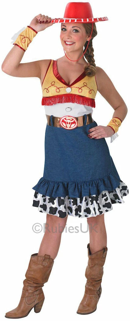 Our Sassie Jessie costume includes a cowgirl style dress with cuffs and moulded red sparkly eva hat with rope effect trim.