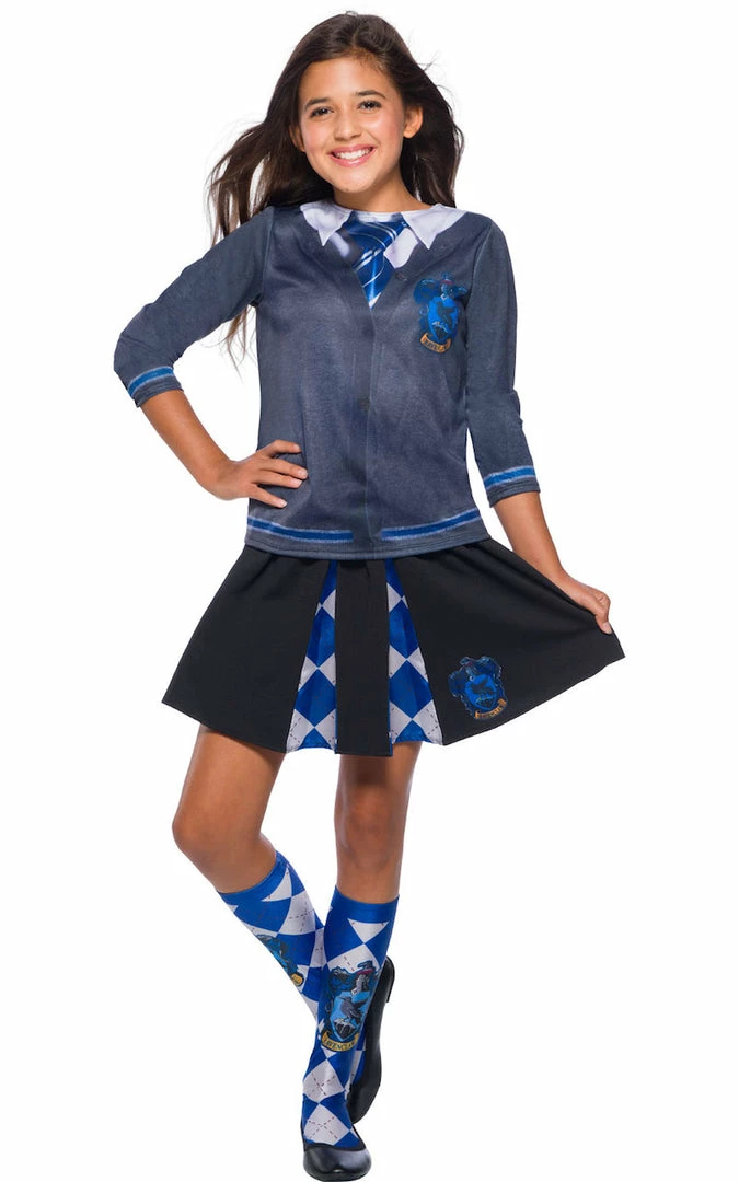 Our Harry Potter Gryffindor Kids Skirt is Black with a Plaid Blue and White Design, plus the Ravenclaw Coat of Arms printed on the side of the Skirt to finish off the look.