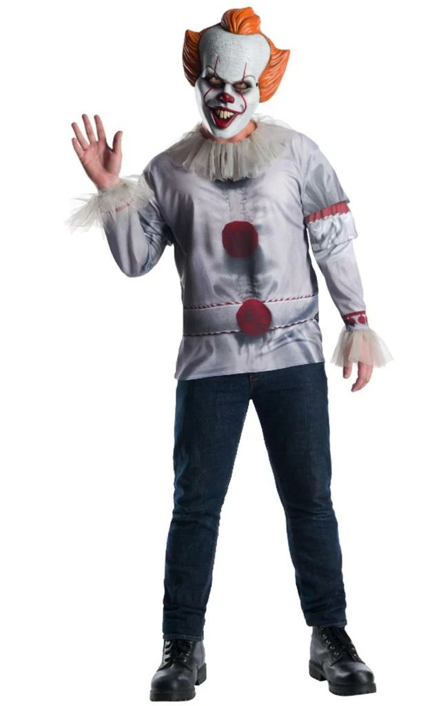 Inspired by the 2017 movie IT and 2019 movie IT Chapter Two, this costume top and plastic face mask set is an instant Pennywise makeover.