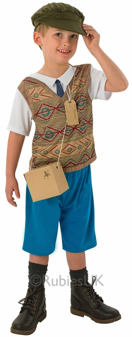 Our Boy’s WW2 evacuee costume includes a colour-in gas mask, Ideal for school themed dress-up days.