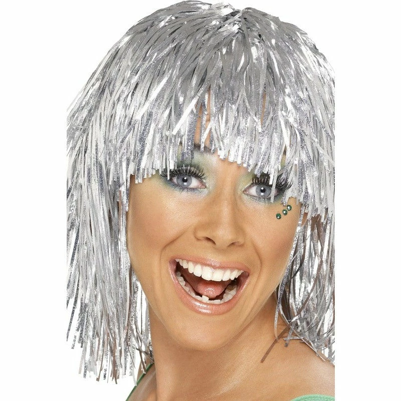 Our Silver Cyber Tinsel Wigs are short with a fringe. Great 1980’s accessory to complete your look.