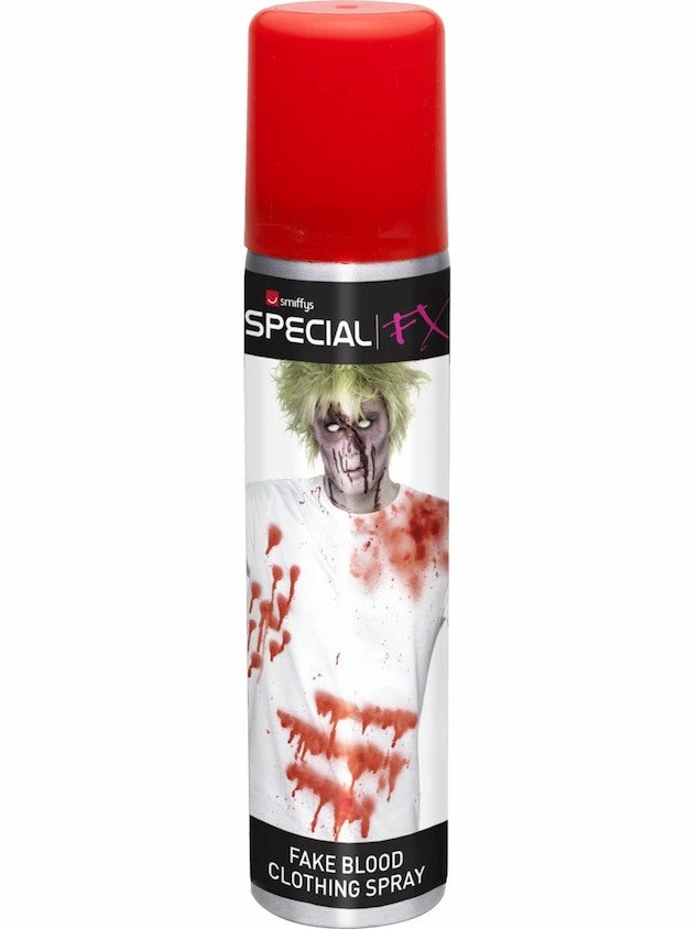 Our Fake Blood Clothing Spray is an easy way to mess up your clothes and horror decor to create realistic blood splatters.