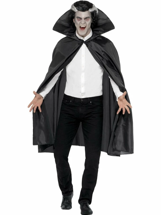 Our Adult Black Fabric Vampire Cape with Stand-Up Collar and neck tie fastening  is perfect for any vampire halloween look.