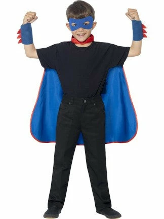 Our blue super hero kit includes eye mask, blue cape with the word boom printed on the rear the kit also includes cuffs.