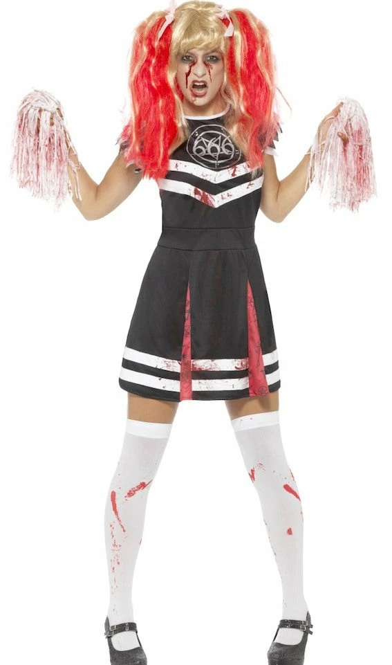 Our Satanic Cheerleader costume is a perfect Halloween choice, which includes the typical cheerleader style dress with a halloween look, with the number 666 printed on the blood stained dress.