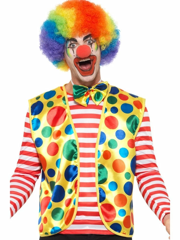 Our Clown Kit includes yellow polka dot printed waistcoat with a matching bow tie.