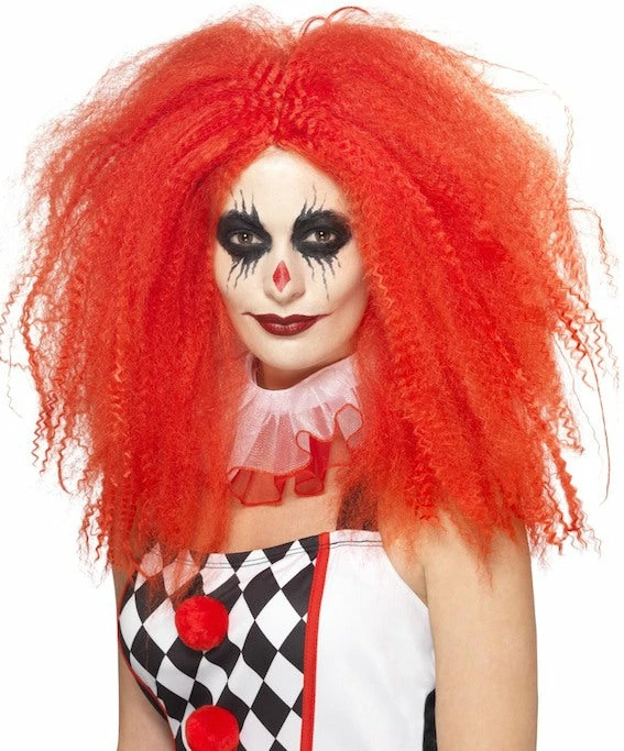 Our crazy clown wig is a great twist on the traditional clown wig, perfect for for any crazy clowns this halloween, complete with middle parting and shoulder length crimps.