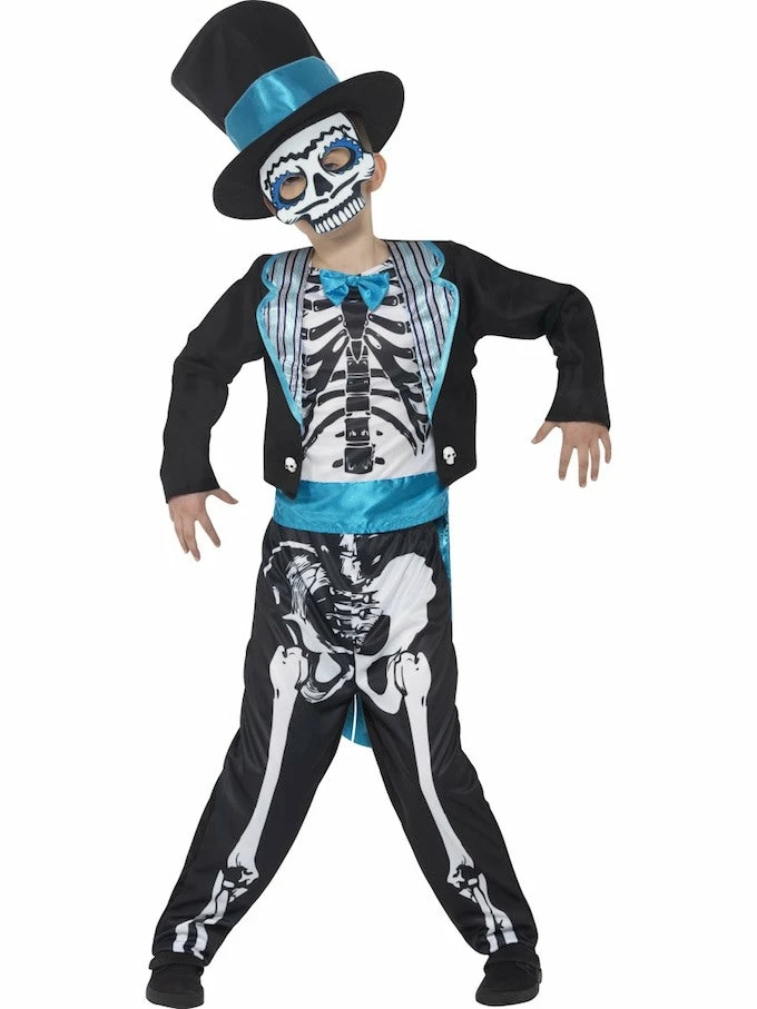 Costume includes mock top- jacket, trousers, shirt front, hat and mask.