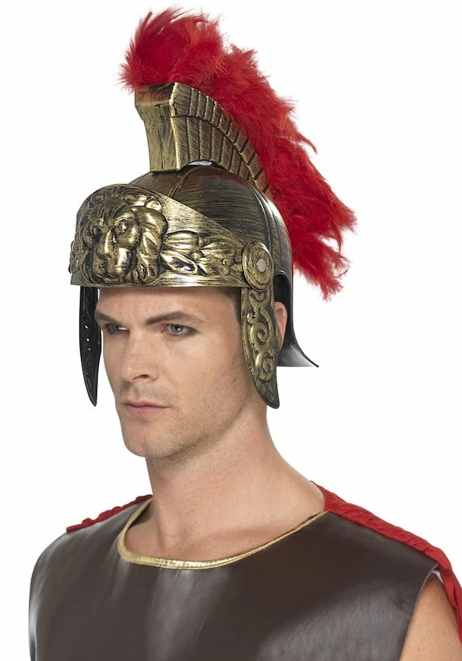 Our Roman Spartan Helmet is gold and red with detachable feather plume.