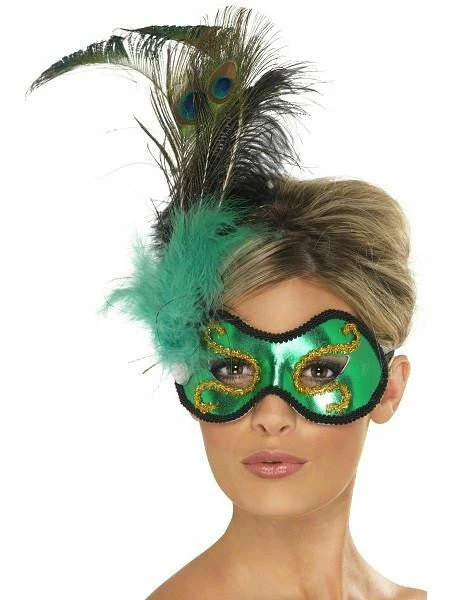 Our emerald green eyemask with peacock feather detail is a must for your masquerade ball.