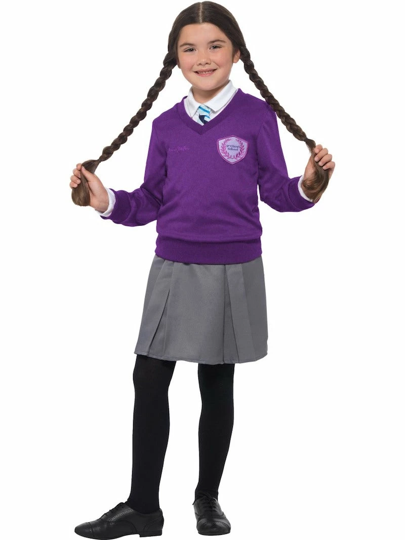 Includes a purple school style jumper and grey pleated front skirt, plus a blue and black school tie.