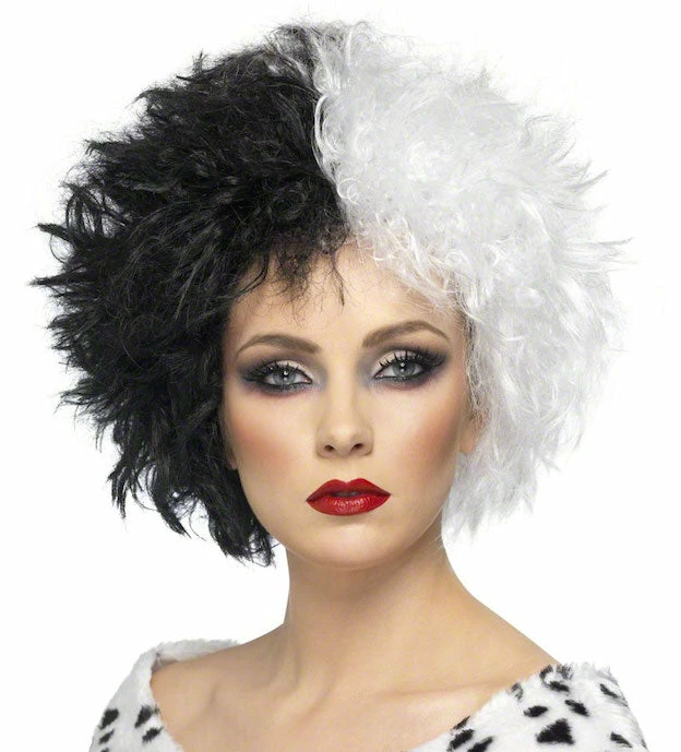 Lock up your Dalmations, this Evil Madame Wig is half black and half white, it is short and curly.