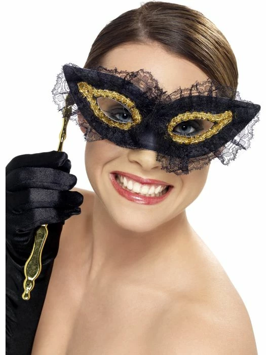 Our black eyemask with gold and black lace trimming is perfect for any masquerade ball.