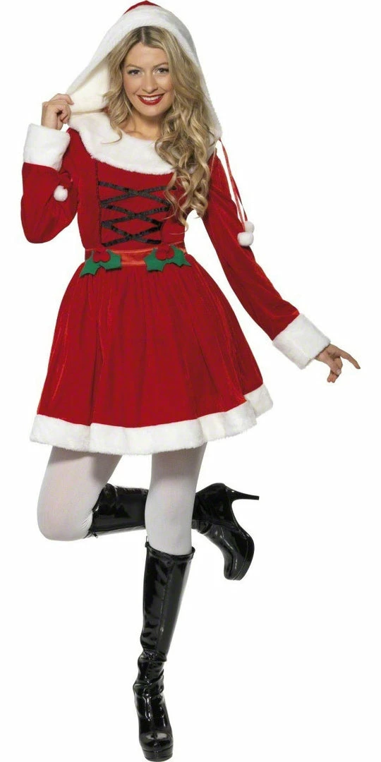 Our Miss Santa costume comes complete with red dress and hood