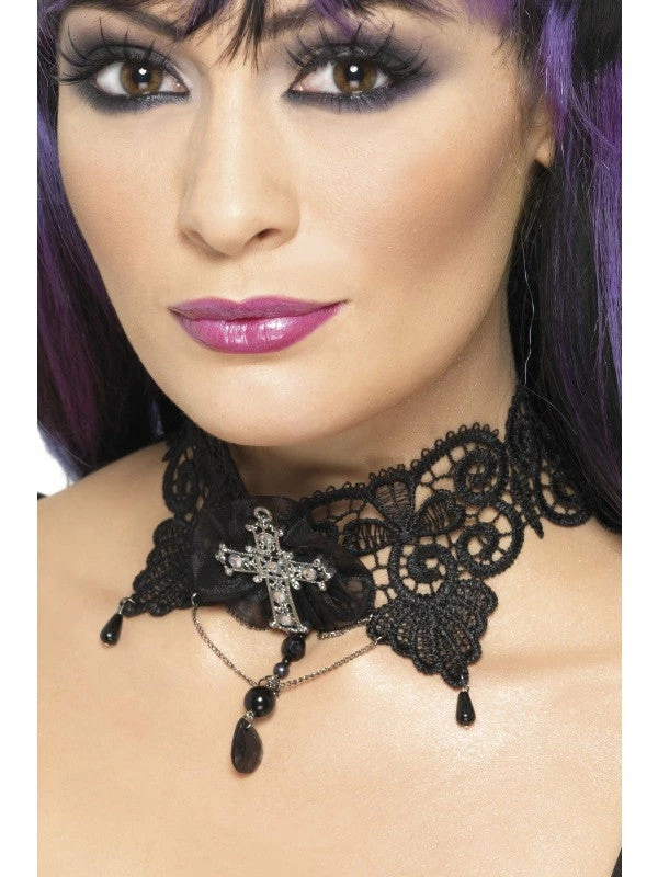 Our Gothic Lace Choker is the perfect Halloween-Gothic finishing touch, complete with jewelled cross.
