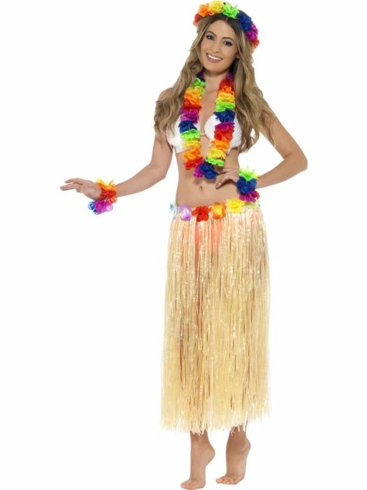 Our Rainbow Hawaiian 4 Piece Set will complete your look just add a grass skirt perhaps and your ready to party!