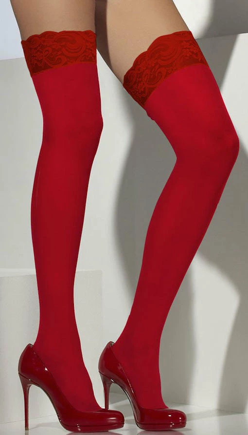 Our Red, Sheer opaque lace hold ups with silicone from the Fever range will help add that finishing touch to your costume.