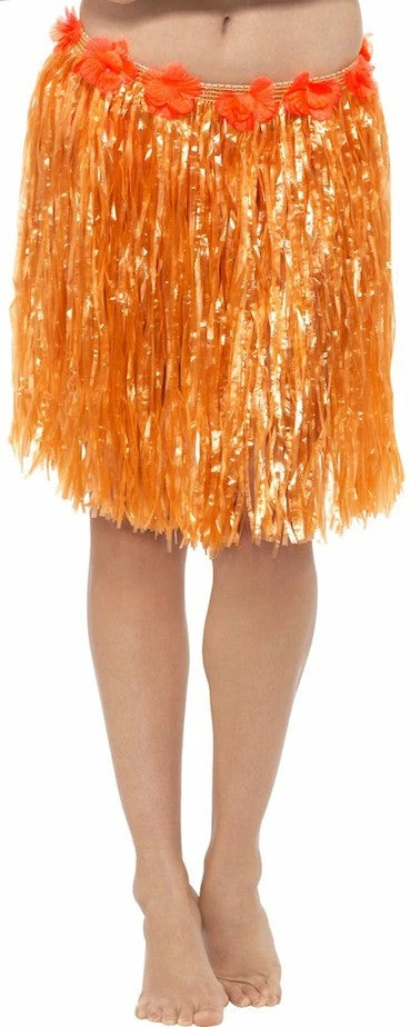 Our Neon Orange, Hawaiian Hula Skirt, with flowers has a velcro fastening and adjustable waist band.